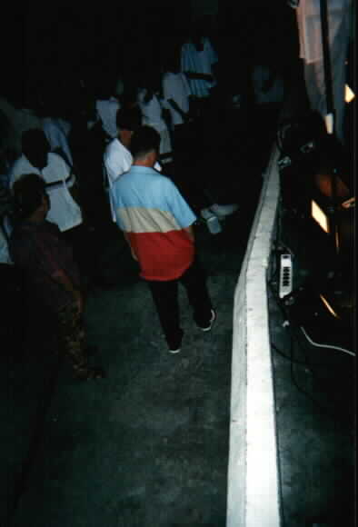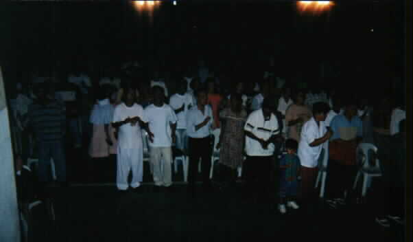 ![]() Local man (far right) is helped in to his chair by his wife and his walker before he is prayed for. |